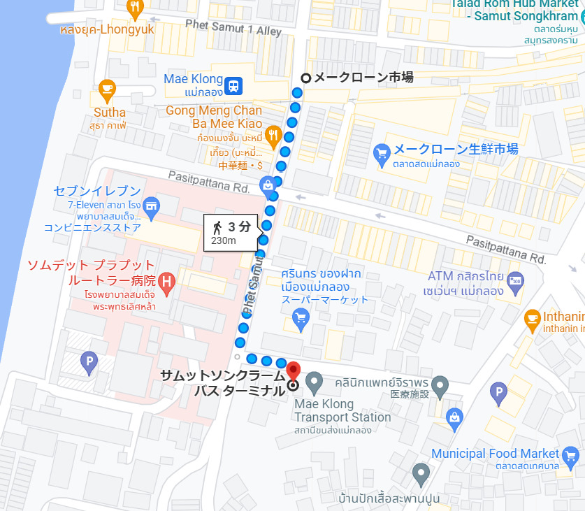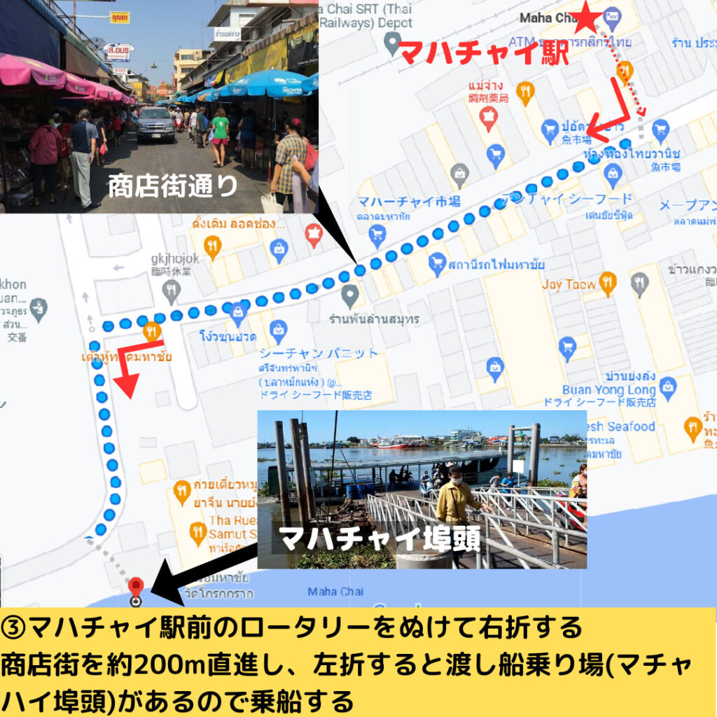 ③マハチャイ駅のロータリーを抜けて右に曲がり商店街を200mほど歩きます